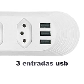 Extensão Tomada Filtro de Linha 3 Entradas USB 1A 4 Tomadas Botão Power Geral x Cabo de 2 metros Bivolt Potência Nominal 2500W - 10A