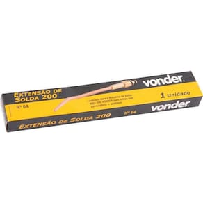 Conteúdo da embalagem 1 Extensão de solda Aplicações e dicas de uso Indicada para o maçarico de solda MSV 200 Vonder para soldas com gás oxigênio+acetileno Destaques e diferenciais Fabricada em cobre eletrolítico, proporcionando maior durabilidade, efetua a mistura dos gases internamente (injetor integrado). Atende às exigências das normas EN 5172 / NR18.