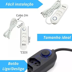 Extensão elétrica resistente 3 tomadas 3usb com botão bivolt Descrição do anúncio: A régua elétrica com 3 tomadas e 3 usb bivolt é a solução ideal para quem busca praticidade e segurança no dia a dia. Com três tomadas universais e três portas usb 5v 2.1a , esta extensão oferece carregamento rápido e eficiente para diversos dispositivos. Seu cabo de 2 metros proporciona maior alcance, enquanto o design compacto e leve facilita o transporte e o uso em diferentes ambientes. Ideal para carregar celulares, alto-falantes usb, ventiladores usb e outros produtos térmicos usb, essa régua é perfeita para uso doméstico e pequenos escritórios. Conteúdo da embalagem: 01 x régua elétrica com 3 tomadas e 3 usb Características: 3 tomadas elétricas espaçadas, permitindo acomodar plugues grandes sem obstruções 3 portas usb para carregar dispositivos móveis como smartphones e tablets Design moderno e funcional, compacto e leve, fácil de transportar Proteção contra surtos elétricos e sobrecargas, garantindo a segurança dos aparelhos conectados Compatível com redes elétricas 127v/220v, funcionando como bivolt automático Fusível de proteção integrado para evitar danos em caso de picos de energia Cabo de extensão de 2 metros para maior alcance Especificações: Modelo: filtro de linha com 3 tomadas e 3 usb Material: plástico resistente Cor: branca transparente Compatibilidade: ideal para uso doméstico e pequenos escritórios Dimensões aproximadas: 30 cm de comprimento x 5 cm de largura x 3 cm de altura Principais perguntas sobre o produto e respostas: O produto é bivolt Sim, o produto é compatível com redes elétricas de 127v e 220v, funcionando como bivolt automático. Qual é o comprimento do cabo de extensão O cabo de extensão tem 2 metros de comprimento, proporcionando maior alcance. As portas usb são rápidas Sim, as portas usb têm uma saída de 5v 2.1a, garantindo carregamento rápido e eficiente. Esta régua possui proteção contra surtos elétricos Sim, o produto possui proteção contra surtos elétricos e sobrecargas, garantindo a segurança dos aparelhos conectados. Pode ser Utilizado para carregar dispositivos usb como smartphones e tablets Sim, as três portas usb são ideais para carregar dispositivos móveis como smartphones e tablets. O produto é leve e fácil de transportar Sim, o design compacto e leve torna a régua fácil de transportar e usar em diferentes ambientes. 4o Marca: Não Informado