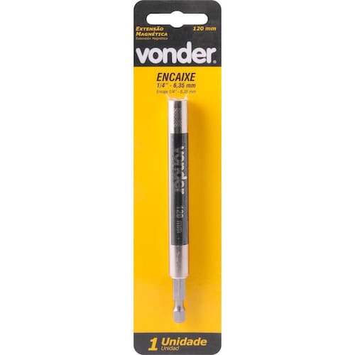 EXTENSAO MAGNETICA 1/4 120MM VONDER A extensão proporciona praticidade para lugares de difícil acesso. Possui encaixe magnético e funciona como guia em lugares aonde o furo é mais espesso. Utilizada em parafusadeiras para apertar ou soltar parafusos de acordo com o bits utilizado não acompanha bits . Material: Aço carbono Acabamento da extensão: Cromado brilhante Medida do encaixe: 1/4 Comprimento estendido: 200 mm Comprimento fechado: 120 mm Marca: Não Informado