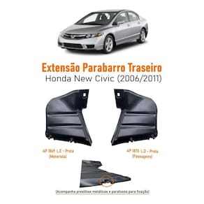 Extensão para-barro para-lama traseiro honda new civic lado esquerdo Aplicações: New civic: 2006 a 2011 Cor: preto Especificações tecnicas: Excelente acabamento Material feito em plástico resistente Fixação firme e encaixe perfeito Fácil instalação Acompanha presilhas metálicas Acompanha parafusos de fixação Conteudo da embalagem: 01 extensão parabarro new civic de 3 meses sobre defeitos de fabricação; Não nos responsabilizamos pelo mau uso ou instalação inadequada do produto; Recomendamos que a instalação seja feita por especializado. A jcb agradece sua preferência. Estamos à disposição para melhor atendê-los Marca: Não Informado Ean: 7908004620046