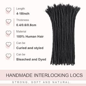 Pontos interligados totalmente feitos à mão, macio, leve e aparência natural. Feito de cabelo 100% humano afro volumosos (você pode fazer o teste de queima). Os locs podem branquear até a cor clara nº 613 no máximo, você também pode tingi-lo para cor escura após o branqueamento. Além disso, pode ser estilizado como pontas coloridas. Os pontos de 15 cm são feitos de cabelo afro de 15 a 20 cm; os pontos de 20 cm são feitos de cabelo afro de 20 a 25 cm; os pontos de 25 cm são feitos de cabelo afro de 25 a 30 cm. O entrelaçado não vai cair. Usamos de 10 a 100 fios para escolher, geralmente de 60 a 100 fios para fazer uma cabeça inteira. Ferramenta intertravada , agulhas de crochê e pente no pacote. Parte superior de cabelo cacheado afro para fácil instalação, você também pode estendê-lo para seus locais para adicionar comprimento ou reparar locs. E também podem ser lavados normalmente. A Daixi Dreadology também oferece extensões de dreadlock artesanais clássicas de 0,2 a 0,8 cm de espessura e peruca locs - Pontos interligados totalmente feitos à mão, macio, leve e aparência natural. Feito de cabelo 100% humano afro volumosos (você pode fazer o teste de queima). - Os locs podem branquear até a cor clara nº 613 no máximo, você também pode tingi-lo para cor escura após o branqueamento. Além disso, pode ser estilizado como pontas coloridas. - Os pontos de 15 cm são feitos de cabelo afro de 15 a 20 cm; os pontos de 20 cm são feitos de cabelo afro de 20 a 25 cm; os pontos de 25 cm são feitos de cabelo afro de 25 a 30 cm. O entrelaçado não vai cair. - Usamos de 10 a 100 fios para escolher, geralmente de 60 a 100 fios para fazer uma cabeça inteira. Ferramenta intertravada , agulhas de crochê e pente no pacote. - Parte superior de cabelo cacheado afro para fácil instalação, você também pode estendê-lo para seus locais para adicionar comprimento ou reparar locs. E eles podem ser lavados normalmente. - A Daixi Dreadology também oferece extensões de dreadlock artesanais clássicas de 0,2 a 0,8 cm de espessura e peruca locs.