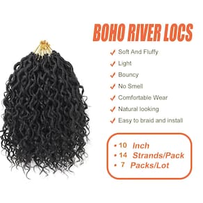 Short Goddess Locs crochê cabelo 35,5 cm River Locs Boho Hippie Locs ondulado crochê com cabelo encaracolado no meio e extremidades tranças extensões de cabelo (7 pacotes, 25,4 cm, 1B) - 1. Material: 100% extensões de cabelo, nova extensão de trança de cabelo de crochê Goddess Locs com encaracolado profundo no meio e nas pontas. - 2. Características: Nova moda, visual moderno e ousado, natural e charmoso. Em comparação com as deusas locs, os river locs são mais adoráveis e completos. Um fio com 2-3 cabelos encaracolados. - 3. Estilo: cabelo trançado de crochê River Locs Goddess. Bonito e moderno, muito fofo, lindos cachos terminam, sentindo-se como uma deusa, parecendo uma rainha. - 4. Tamanho: 25,4 cm de comprimento, Peso: 40 g, Cor: 1B. Fios: 14 fios/pacote, 7 pacotes/lote (98 fios/lote). Vem com uma agulha de crochê . - 5. Vantagem: muito leve, sem cheiro, não é fácil de separar, fácil de instalar, cabelo bonito e aparência natural, o cabelo de crochê Goddess Locs é adequado para mulheres de todas as idades. Os pontos falsos seguram bem, adequados para uso diário, natação, atividades ao ar livre, festa, cosplay, apresentação, presente, casamento, etc.
