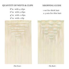 - Estilize seu cabelo em casa. -- As extensões de cabelo vêm com estilo liso. E se você quiser cabelos encaracolados, você pode enrolar as extensões de cabelo com modelador de cachos (temperatura de aquecimento preferencialmente abaixo de 160 ?). Recomendamos que você escolha a cor por sua própria cor de cabelo para um melhor efeito de mistura. 1-2 conjuntos são recomendados para volume de cabelo médio, 2-3 conjuntos adequados para volume de cabelo esparso.