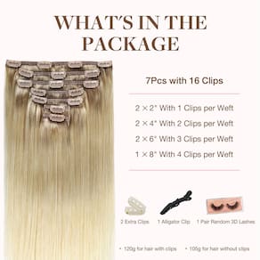 Extensões de cabelo com clipes: conjunto de 7 peças de 120 g. Peso líquido de 105 g para cabelo sem clipes, 120 g para cabelo com clipes. Um conjunto para cabelos grossos, dois conjuntos para cabelos finos. Se você quiser adicionar comprimento e volume, recomendamos que você escolha 2 conjuntos.