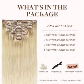 Extensões de cabelo com clipes: conjunto de 7 peças de 120 g. Peso líquido de 105 g para cabelo sem clipes, 120 g para cabelo com clipes. Um conjunto para cabelos grossos, dois conjuntos para cabelos finos. Se você quiser adicionar comprimento e volume, recomendamos que você escolha 2 conjuntos.