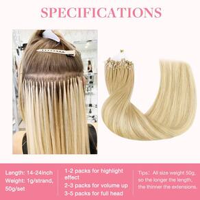 - Peso de ajuste e comprimentos versáteis: Se você deseja 35,5-40,6 cm (50 fios) ou 45,7-61 cm (50 fios), nossas extensões de cabelo humano Micro Link Tip 50 g garantem um ajuste personalizado. Se o seu cabelo for grosso, precisa de 1-2 pacotes, se o seu cabelo for fino, precisa de 3-4 pacotes