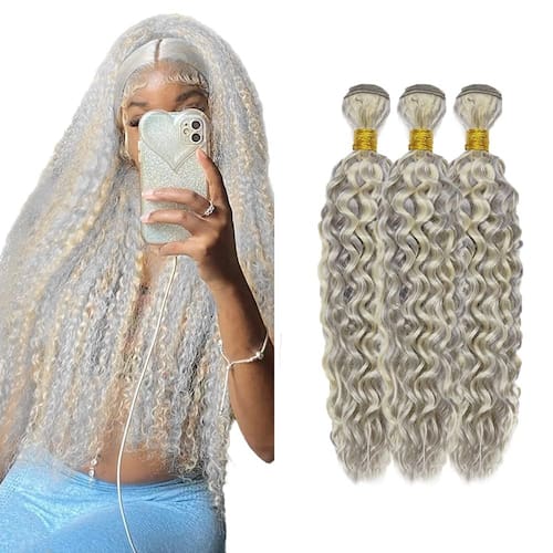 - ?Tipo e cor do pacote de cabelo? Cabelo humano ondulado encaracolado. Cor cinza/613, cinza de dois tons misturado com loiro.