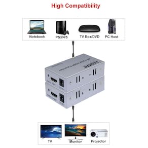 Extensor 4k hdmi até 80m amplificado com fonte Este extensor usa cabos cat5e ou cat6 únicos cat6 é recomendado em vez do cabo hdmi para transmitir a elevação Os sinais audio e vídeo da definição até 120 medidores, este prolongamento são projetados fornecer para a grande distância Transmissão de sinal de alta definição.