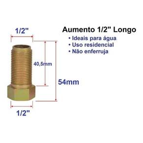 Informações do Produto: - Para Torneira com Rosca de 1/2. - Extensão de 54mm com rosca de 1/2 para torneiras. - Ideal para instalações que necessitam aumentar o comprimento no ponto d'água. - Material de qualidade. -100% Metal Latão . - Não enferruja. - Produto resistente e duradouro. - Funciona em alta ou baixa pressão. - Indicado para instalações de água quente ou fria. Marca: Modelar Ean: 7800402198557
