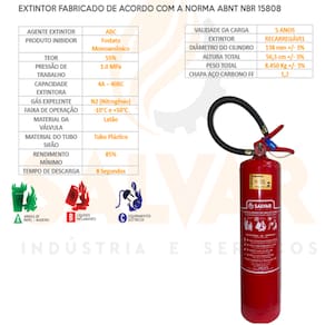 EXTINTOR ABC 6KG 4A 40 BC – portátil de pressurização direta, com carga de pó químico seco ABC, fabricado conforme ABNT NBR 15808:2010 em chapa de aço carbono. Destinado ao combate de princípios de incêndio das Classes A (Resíduos Sólidos), B (Líquidos inflamáveis), C (equipamentos Elétricos), com pressão de trabalho de 10,5 Kgf.cm2. Pintado pelo processo eletrostático com tinta em pó na cor vermelha. Mangueira em borracha com trama de nylon. Fornecido com suporte de parede formato “L” e possui garantia pelo período de um ano contra defeitos de fabricação desde que o lacre de segurança esteja inviolado. Incluso Placa de Sinalização Fotoluminescente Normatizada E5 e Suporte de Parede. Capacidade Extintora: 4-A:40-BC Validade da carga: 5 anos. Marca: SALVAR
