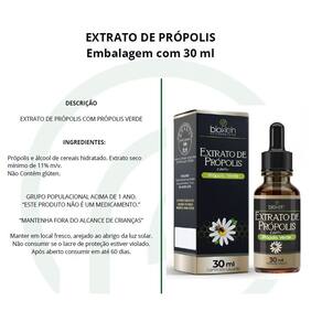 Composição: Própolis e álcool de cereais hidratado. Extrato seco mínimo de 11% m/v.