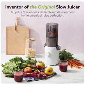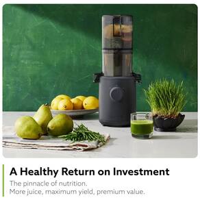 Funil de autoalimentação V2 O H310 Slow Juicer vem com um funil de autoalimentação atualizado que é menor que o do H200, mas ainda acomoda frutas inteiras. Pequeno e leve com um diâmetro de apenas 4 polegadas e peso inferior a 8 libras, o H310 ocupará pouco espaço e não sobrecarregará as mãos. Qualidade e durabilidade Feito de um corpo de plástico ABS livre de BPA e resistente a impactos, nossos Slow Juicers são projetados para uso diário e são extremamente duráveis. Além disso, o filtro Ultem e o sem fim reforçados do H310 são 8 vezes mais fortes do que os plásticos tradicionais. Segurança Como em qualquer outro Hurom Slow Juicers, o H310 Slow Juicer é feito de todos os materiais livres de BPA. Câmara sem filtro O H310 apresenta um mecanismo revolucionário sem filtro. O filtro é praticamente embutido dentro da câmara e o sem fim de duas partes se encaixa para coar o suco sem polpa o que significa limpeza mínima para suco de alta qualidade Tecnologia Slow Squeeze Emulando o processo de compressão manual real, o H310 Slow Juicer gira a uma velocidade de apenas 43 rotações por minuto. A exclusiva e patenteada tecnologia Slow Squeeze da Hurom mantém seu suco em seu estado mais natural, mantendo se fresco por mais tempo. Rendimento Nosso sem fim exclusivo de baixa velocidade extrai até a última gota de suco possível de frutas e vegetais, deixando para trás uma polpa seca e toda a bondade em seu copo.
