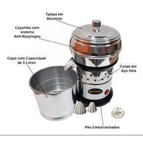 O extrator de sucos CADINOK é super potente e silencioso, extraindo o suco de laranja ou limão com uma rapidez incrível. Sua tampa e caçamba é fabricada em alumínio e seu corpo é produzido em Aço Inox Escovado, aumentando a durabilidade e facilitando a limpeza e higienização do produto. O copo para armazenamento do suco é fabricado em alumínio com capacidade para 3 litros e é o maior disponível no mercado, suas carambolas não deixam qualquer sabor no suco extraído, garantindo a sua qualidade e pureza. Possui o motor mais potente da categoria e não trava no meio do processo.Características:-fabricante CADINOK-modelo grande-uso INDUSTRIAL / RESIDENCIAL-potência Máxima 1/3 HP - 500W Watts-RPM 3545-altura 31cm Largura 18cm-bivolt Chaveado-peso 4,0 Kg-caçamba em alumínio com sistema anti-respingos-tampa em alumínio-copo em alumínio com capacidade máxima de 3 Litro-1 Castanha Grande Laranja 1 Castanha Pequena Limão-corpo do motor em Inox-pés anti-deslizantes Marca: Kadinok