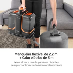 Maior Alcance: Com mangueira de 2,2 metros e cabo elétrico de 5 metros, a extratora e higienizadora acessa áreas distantes, permitindo uma limpeza mais completa e sem interrupções para troca de tomada.