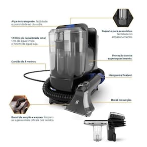 A potência de 1600W da sua Extratora Britânia garante uma limpeza rápida, eficiente e visivelmente superior. E com o cabo de 3 metros e mangueira de 1,4 metro, você alcança todos os cantos com facilidade. Depois, tudo fica organizado com o suporte de acessórios.