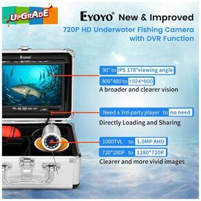 Câmera de pesca subaquática Eyoyo Este é o localizador de peixes de vídeo portátil atualizado da Eyoyo. Câmera AHD 720p atualizada tela IPS 1024x600 de função DVR, traz para você um mundo subaquático mais distinto e realista. Câmera AHD 720p atualizada Em comparação com a antiga câmera 1000TVL, a nova câmera com resolução de 1280x720 torna as imagens mais claras e as cores mais vivas. Função DVR atualizada Comparado com a versão antiga, os vídeos devem ser reproduzidos por um player de terceiros, este atualizado pode ser aberto diretamente no navegador ou telefone celular e compartilhado diretamente. E um cartão de memória de 8GB está incluído. 12pcs IR Lights Estas 12pcs IR Lights fornecem uma fonte de luz imperturbável se a luz for fraca debaixo dágua, permitindo que você observe os peixes no escuro. Observe a imagem ficará preta e branca no escuro quando as luzes IR estiverem acesas e as luzes podem ser desligadas desconectando o conector Marca: Não Informado