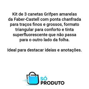 Descrição Com o kit grifpen amarelo faber castell, você conta com 3 canetas para destacar suas ideias e expressar sua criatividade. Cada caneta possui ponta chanfrada para traços finos e grossos, além de cor superfluorescente para um destaque ainda maior. O formato triangular garante maior conforto na escrita e a tinta não passa para o outro lado da folha. Inove na escrita com o kit grifpen amarelo faber castell.