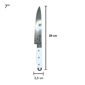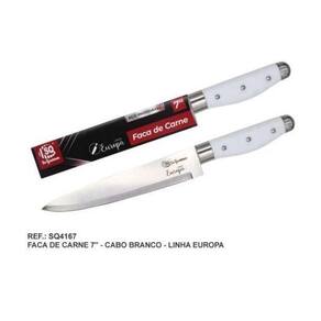 Faca 7' inox cozinha carne legumes frutas peixe churrasco Contém: 1 faca de 7 polegadasDescrição:Cabo: plástico branco formato anatômico ;Lamina: inox; Largura da lamina: 2mm; Tamanho da lamina: 178mm; Tamanho do cabo: 112mm; Tamanho total: 29cm; Largura do cabo: 16mm; Lâmina estampada em aço inox; Tratamento térmico total; Indicada para cortar e fatiar carnes, legumes e verduras; Cabo injetado em polipropileno fixados por rebites de alumínio; Ponta do cabo reforçada com capsula de aço para auxiliar na quebra de cascas; Reforço de aço na parte de baixo do cabo garantindo maior fixação e resistência.