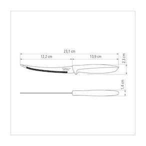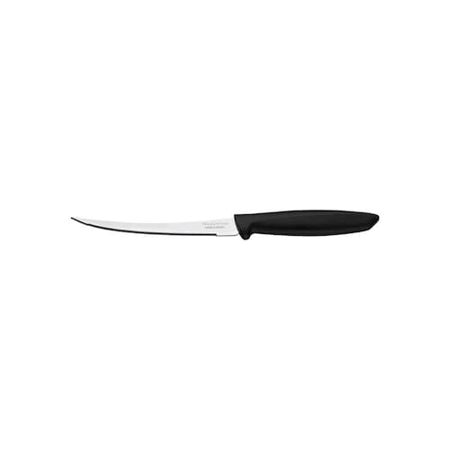 - Marca: Tramontina; - A lâmina microsserrilhada rompe a pele do tomate sem amassar; - A lâmina de aço inox têm maior durabilidade do fio devido ao tratamento térmico; - O cabo de polipropileno possui maior resistência e durabilidade; - Pode ir à máquina de lavar louças facilitando seu dia a dia; - Peso: 35 gr; - Garantia: 90 dias para vícios ou defeitos de fabricação.
