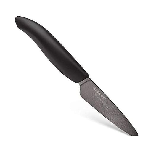 Faca Ceramica Kyocera - Lamina Negra 3.0 Cabo Preto As facas de Cerâmica Avançada Kyocera fabricadas em Zircônia, o óxido de zircônio é extremamente rígido, resistente ao desgaste e quimicamente inerte, para os técnicos, o óxido de zircônio tem uma rigidez de 8.2 mohs vs. Aço em 56 mohs e diamante em 10mohs . Além da resistência ao desgaste, as facas de cerâmica Kyocera são quimicamente neutras, fazendo com que os alimentos conservem a aparência e sabores . A sua superfície polida resiste a germes e bactérias além de não sofrer com a ação de ácidos, óleos e sais, são de limpeza muito fácil, simplesmente lave e seque. Com a metade do peso de uma faca equivalente de metal a faca de cerâmica é perfeitamente balanceada, tornando a confortável para seu uso, reduzindo a fadiga e esforço para cortar e fatiar os alimentos. Todas as facas perdem o fio com o tempo, sendo que a cerâmica estará mais afiada no início e permanece afiada por muito mais tempo. Com o tempo poderá notar pequenas lascas no fio da lâmina, trata-se de um processo normal pelo qual as lâminas de material duro perdem o fio. Comprimento 26 Largura 6 Altura 3 Peso 95 g Marca: Não Informado