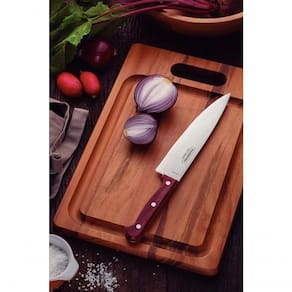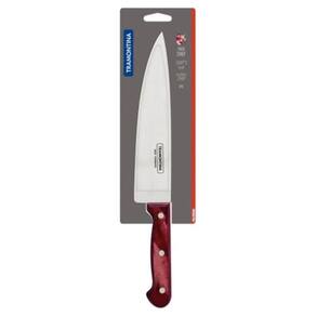 Faca Chef Tramontina Polywood 8 Aço Inox Vermelho Talheres de qualidade deixam sua mesa muito mais convidativa. Um exemplo é alinha Polywood que, com seus cabos de madeira tratada, faz bonito em encontros mais informais. Recomendações de Uso: Antes do uso: Antes de utilizar o , remova as eventuais etiquetas e lave-o com água e de uso: Durante a lavagem use somente esponja macia, outros tipos de produtos, como palha de aço, poderão riscar ou prejudicar o brilho do aço inox. Enxágue bem a peça a fim de remover totalmente os resíduos dos produtos de limpeza, que por serem abrasivos, podem danificar o inox. Após a lavagem enxugue a peça, pois as substâncias químicas contidas na água poderão causar manchas. Sempre que possível use água quente, pois renova o brilho do talher. Evite o das peças com superfícies quentes, pois podem provocar a descoloração do produto. Quando usar a máquina de lavar louça, recomendamos retirar o talher logo que tenha terminado o ciclo enxaguar, a fim de que os mesmos sejam secados manualmente. Tenha cuidado ao manusear produtos cortantes e perfurantes e mantenha-os fora do alcance de crianças.- Foto meramente ilustrativa. Informações Adicionais: