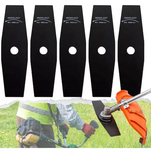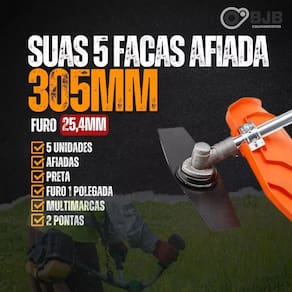 Características: Quantidade: 5 peças Marca: BJB Compatibilidade de máquinas: Roçadeiras Compatibilidade de marcas importadas: Terra, Toyama, Branco e outras similares. Diâmetro 330mm Furo: 20mm Pontas: 2