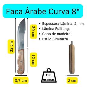 Faca 8'' modelo árabe com desenho estilizado de cimitarra, bom efeito visual e ótima para cortar carnes. Indicada tanto para quem corta na tábua quanto no espeto.
