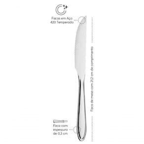Os talheres da linha Lyon têm traços simples, leves e elegantes, podendo compor desde cozinhas mais descontraídas até as sofisticadas. As facas de mesa são perfeitas para compor a mesa no almoço ou no jantar. Temperadas, as facas não danificam pratos de porcelana. Feitos em aço inox, os produtos são resistentes à oxidação e podem ser levados à lava-louças.