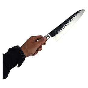 A faca possui um cabo de madeira e uma lâmina de aço inoxidável com marcas decorativas. Essa faca é versátil e adequada para uma variedade de tarefas na cozinha. Com seu cabo confortável e lâmina afiada, ela proporciona um manuseio preciso e seguro.