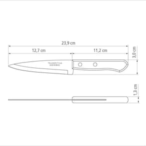 A Faca de Cozinha Tramontina Dynamic em Inox com Cabo de Madeira 5 possui lâmina de aço inox, ideal para diversos usos na cozinha, seja cortando legumes frescos, carne suculenta ou até mesmo fatiando pães. Garante cortes uniformes e eficientes, tornando o preparo dos alimentos uma verdadeira experiência prazerosa.O cabo de madeira natural não só confere um toque de elegância à faca, mas também proporciona uma empunhadura confortável e segura. Com rebites de alumínio, o cabo é firmemente fixado à lâmina, garantindo estabilidade e durabilidade incomparáveis. Adquira já a sua Faca de Cozinha Tramontina Dynamic e experimente o verdadeiro prazer de cozinhar!