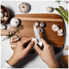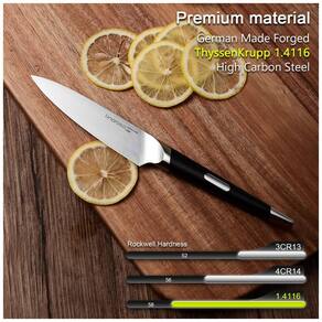 Aço alemão premium A faca de corte Linoroso , é fabricada com aço inoxidável 1.4116 alemão de alto carbono forjado e habilmente forjado, um dos melhores materiais de cutelaria culinária do . Por meio de um rigoroso processo de endurecimento que envolve tratamento térmico a vácuo e resfriamento rápido, a lâmina chega aos 58 na escala de dureza Rockwell. A integração do cromo no aço inoxidável 1.4116 também resulta em um produto extremamente robusto, durável, firme e resistente à ferrugem corrosão. Razor Sharp Edge A lâmina da faca de descascar Linoroso é afiada por uma retificadora automática que alcança com precisão um ângulo de 11 a 12 graus por lado para máxima nitidez e retenção de bordas. Isso garante ao manipulador um corte uniforme e sem esforço, sempre. Design moderno e inovador Com seu design moderno, elegante e ergonômico, esta faca de cozinha multifuncional é adequada para a maioria das tarefas de corte de cozinha, como picar, cortar ou cortar em cubos. Mais do que mera estética, o material ABS antiderrapante na alça permite segurar a faca com firmeza, independentemente da umidade, enquanto a espiga de aço inoxidável integrada permite um equilíbrio controlado durante o corte. Bandeja de facas de carvalho elegante incluída Cada compra vem com uma requintada caixa de facas de carvalho personalizada para resolver problemas de zenamento que surgem com a compra de uma faca. A bandeja de facas pode caber facilmente nas gavetas da cozinha padrão e pode ser colocada em bancadas, pois a caixa inclina a lâmina da faca, com a borda para baixo Marca: Não Informado
