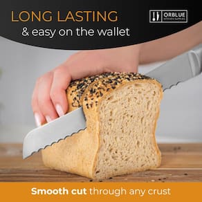 - ULTRA-AFIADA, CORTA SEM ESFORÇO: A lâmina da faca de pão serrilhada Orblue tem uma borda serrilhada ultra-afiada que agarra e fatia sem esforço os pães mais duros, para proporcionar um corte suave e limpo. A lâmina tem 8 polegadas de comprimento com uma alça de 4,9 polegadas. Incluído como medida de segurança adicional na ponta afiada da faca está um protetor de segurança de borracha.
