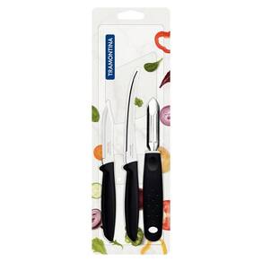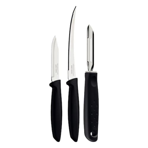 Kit Cortar com Faca de Tomate, Legumes e Frutas e Descascador de Batata Plenus Tramontina Aço Inox Preto 03 Peças - O kit cortar Tramontina Plenus com lâminas em aço inox e cabos de polipropileno preto 03 peças é a escolha ideal para quem não abre mão de uma alimentação mais saudável, repleta de legumes e verduras. Composto por descascador, faca para legumes e frutas e faca para tomate, ele irá garantir um excelente corte dos alimentos e maior resistência, pois tem sua produção composta por lâmina em aço inox e cabos de polipropileno. Escolha Tramontina e garanta muita praticidade na hora de preparar suas refeições!
