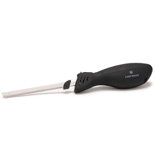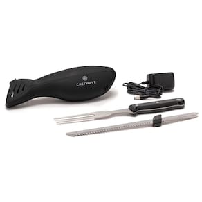 Duas lâminas serrilhadas de aço inoxidável sem fio, lâmina de escultura, garfo de serviço, cabo de carregamento, estojo de armazenamento, fácil de cortar carnes, perú, pão, frutas, bateria recarregável de íon de lítio (embutida), trava de segurança liga/desliga, leve