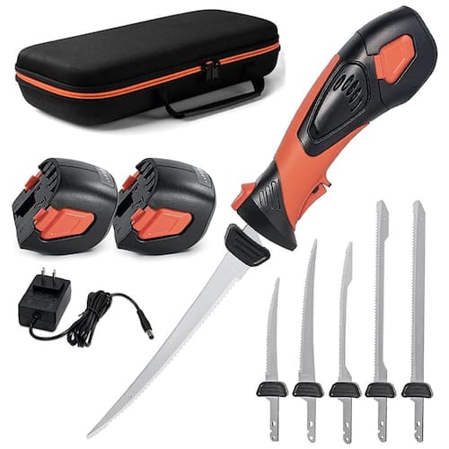 Eleve sua experiência de pesca com o Conjunto de Facão Elétrico Sem Fio da Pratuor. Este kit de qualidade profissional inclui cinco lâminas de aço inoxidável ultra afiadas e substituíveis, duas baterias recarregáveis e uma prática bolsa de armazenamento, garantindo que você tenha tudo que precisa para filetar sem complicações! Mantenha a ação com duas baterias recarregáveis substituíveis. Cada bateria oferece até 40 minutos de autonomia, permitindo que você processe de 15 a 20 peixes com peso entre 4,5 a 11,3 kg. As lâminas revestidas de Titânio oferecem versatilidade, com cinco opções de tamanhos para diferentes tipos de peixe, como crappie, badejo e atum. A empunhadura ergonômica com aderência antiderrapante e trava de segurança proporciona controle aprimorado e operação segura durante o filetamento. Além disso, o conjunto inclui uma bolsa de transporte de alta qualidade para facilitar o transporte de todos os acessórios.