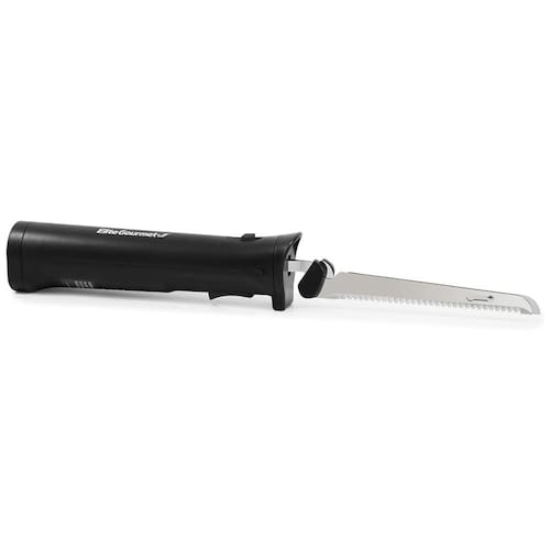 PUNHO RECARREGÁVEL SEM FIO O cabo de recarga removível permite fácil acesso pela cozinha com facilidade, sem um cabo de alimentação pesado. TEMPO DE RECARGA RÁPIDA PARA USO FINAL Leva apenas 1,5 horas para carregar até 70 minutos de uso contínuo. QUATRO LÂMINAS DE AÇO INOXIDÁVEL Esta faca elétrica possui dois conjuntos de lâminas serrilhadas alternativas com protetores de dedos de segurança. USO MULTIUSO Perfeito para fatiar carnes, ótimo para pães. Corte facilmente tudo, desde presunto, peru, pães e tomates até espuma de artesanato para projetos de bricolage. GATILHO FÁCIL DE UM TOQUE Um botão de gatilho simples permite ativar com segurança sua faca de escultura elétrica e desconecta a energia assim que o gatilho é liberado. DESIGN LEVE O design leve facilita o manuseio da faca elétrica ao esculpir grandes quantidades de alimentos ou itens