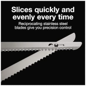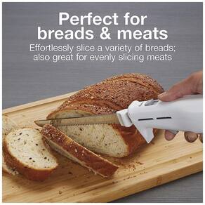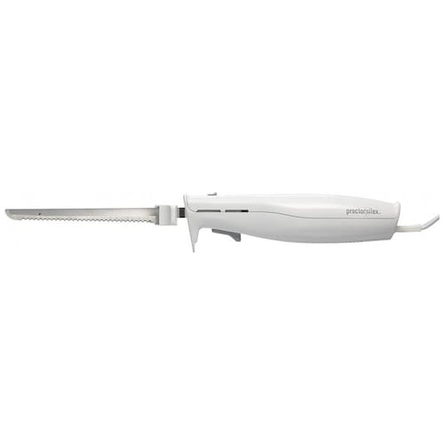 Faca elétrica Proctor Silex 74311PS ideal para cortar carnes e pães, com lâminas serrilhadas de aço inoxidável, alça ergonômica e controle fácil por botão de toque.Vendido e entregue por Ecletiq