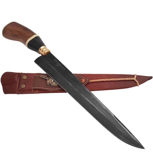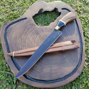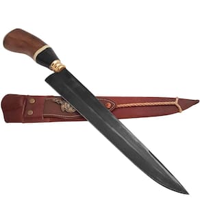 Garantia: 90 Dias / Peso: 385g / Ref: 2010SLP Dimensões da Faca: 38cm (C) x 4cm (L) x 3,5cm (A) Dimensões da Bainha : 29m (C) x 5cm (L) Dimensões Lâmina: 25cm / 10 Polegadas Espessura da Lâmina: 3mm Cuidados: Guardar limpo e seco. *As tonalidades das facas variam por serem produzidas artesanalmente.