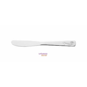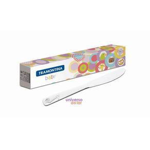 Faca Infantil A linha infantil Baby é a mais tradicional da Tramontina para papais e mamães que buscam produtos com a higiene do aço inox.Totalmente feita de aço inox, por isso não solta nenhum resíduo nos alimentos, mantendo-os saudáveis. Altamente durável mantém suas características originais, preservando a beleza, a higiene e a durabilidade do material. Faca com formato ergonômico, especialmente criada para incentivar e auxiliar no desenvolvimento das crianças. Acabamento em brilho, com desenho estampado em alto-relevo. Pode ser lavada diariamente na máquina de lavar louças.. Recomendações Durante a lavagem, use apenas sabão ou detergente e uma esponja macia. Outros tipos de produtos, como palha de aço, poderão riscar ou prejudicar o brilho dos talheres. Enxágue bem cada peça a fim de remover totalmente os resíduos dos produtos de limpeza, pois, por serem abrasivos, podem prejudicar o inox. Sempre que possível, use água quente, pois renova o brilho do talher. Após a lavagem, enxugue imediatamente os talheres, caso contrário, as substâncias químicas da água (cloro) poderão causar manchas. Evite atrito entre os talheres durante o processo de lavagem e no armazenamento, para mantê-los sem riscos. Evite o contato das peças com superfícies quentes. Elas provocam a descoloração do produto. Não guarde os talheres em locais úmidos. A umidadetambém provoca manchas. Ao usar a lava-louça, recomendamos retirar os talheres logo que tenha terminado o ciclo ''enxaguar'', a fim de que sejam secados manualmente.