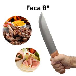 Faca 8'' cabo de madeira lamina reta, bom efeito visual e ótima para cortar carnes. Indicada tanto para quem corta na tábua quanto no espeto.