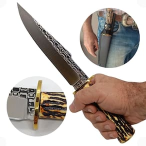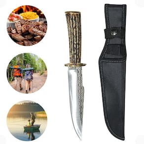 Peso da faca: 335 gramas; Comprimento total da faca: 31,0 cm; Comprimento da lâmina: 19,0 cm - 7,5 polegadas; Largura da lâmina: 3,5 cm; Espessura da lâmina: 4,0 mm; Comprimento do cabo: 12,0 cm; Material da lâmina: aço inox; Material do cabo: resina imitando osso; Cor da lâmina: prata; Formato da lâmina: clip point;