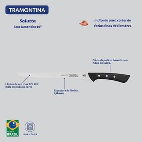 Faca Jamoneira Tramontina Solutta Com Lâmina Em Aço Inox E Cabo Em Policarbonato Preto 10 Polegada Faca Jamoneira Tramontina Solutta com Lâmina em Aço Inox e Cabo em Policarbonato Preto 10 Com a faca Jamoneira Tramontina Solutta com lâmina em aço Inox e cabo em policarbonato 10 polegadas preto, o preparo de alimentos se torna mais prático e funcional. A lâmina em aço inox oferece um fio resistente e durável. O cabo em policarbonato com fibra de vidro proporciona conforto e firmeza durante o uso. Certificada pela NSF, a faca é também com lava-louças, garantindo praticidade e facilidade para o uso diário na cozinha.