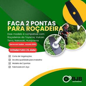 Características: Quantidade: 5 peças Marca: BJB Compatibilidade de máquinas: Roçadeiras Compatibilidade de marcas importadas: Terra, Toyama, Branco e outras similares. Diâmetro 330mm Furo: 20mm Pontas: 2