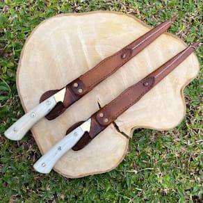 Detalhes do produto: - Lâmina full tang, sendo caracterizada por sua lâmina que se estende por todo o comprimento do cabo, o que garante maior firmeza e resistência mesmo durante atividades mais bruscas; - Desenvolvida artesanalmente, cada peça única e exclusiva, devido a isso, o cabo e a bainha poderão ter tonalidades diferentes; - Acompanha bainha em couro bovino.