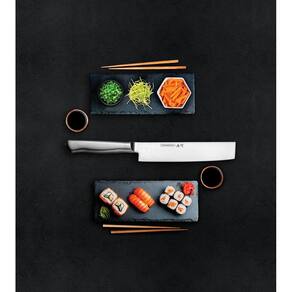 Faca Nakiri Tramontina Sushi Diamond com Lâmina e Cabo em Aço Inox 7" Você irá levar o melhor da culinária oriental para dentro da sua casa com a Faca Nakiri Tramontina Sushi Diamond com Lâmina e Cabo em Aço Inox 7 Polegadas. Perfeita para ser usada em legumes e vegetais, ela possui uma lâmina de aço inox mais larga, proporcionando um corte rápido e uniforme. Fácil de usar, possui ranhuras no cabo que garantem total firmeza durante o manuseio. O cabo de aço inox é resistente e fácil de limpar. Uma peça especial para quem ama a culinária oriental. Informações Gerais Lâmina mais larga que proporciona um corte rápido e uniforme em legumes e vegetais. Cabo e lâmina de aço inox de alta performance com fio especial para cortes precisos. O cabo ergonômico proporciona maior segurança, equilíbrio e conforto na hora do corte.