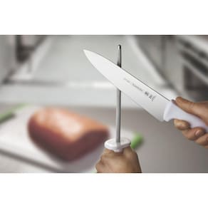 Qualidade e durabilidade para profissionais que trabalham muito. Com tecnologia de ponta, as facas profissionais estão sempre preparadas para entrar em ação e fazer bonito com qualquer ingrediente. Eficiência é o que não falta. A altíssima qualidade das lâminas, resultado do tratamento térmico composto por têmpera (aquecimento da lâmina), subzero (resfriamento de 50 a 196 graus negativos) e revenimento (aumento da elasticidade do aço) garante vida longa e eficiente. A anatomia e ergonomia do cabo de polipropileno texturizado, injetado diretamente sobre a espiga da lâmina, oferecem segurança e conforto durante o manuseio. A proteção antimicrobiana inibe e reduz o crescimento de bactérias e fungos. Essa tecnologia é incorporada durante o processo de fabrição do cabo e dura por toda vida útil do produto, mas não não elimina a necessidade de lavá-los. Orientações Lâmina de aço inox DIN 1.4110.Cabo de polipropileno. Observações USO SEGURO E ADEQUADO:Produtos cortantes e perfurantes, tenha cuidado ao manusear e mantenha fora do alcance das crianças.Para maior durabilidade dos produtos recomenda-se secar bem depois de lavar, mesmo após lavagem em máquina de lavar.Para descarte dos produtos e embalagens sigas as orientações de reciclagem vigentes. Características Gerais EAN13 7891112057883 DUN14 17891112057880 NCM 8211.92.10 Peso Líquido 0,1316 kg. Peso Bruto 0,1366 kg. Metragem 0,000325 m³. Dimensões Embalagem (Compr. X Larg. X Alt.) 295x 50x 22 mm. Dimensões Produto (Compr. X Larg. X Alt.) 295x 54x 22 mm. Espessura 3,0 mm. Cor 1 FFFFFF Hexa