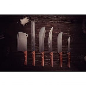 Com lâmina rígida e ponta curvada, é ideal para cortar carnes cruas, assadas ou âmina de aço inox de madeira.Rebites aço inox escurecido.