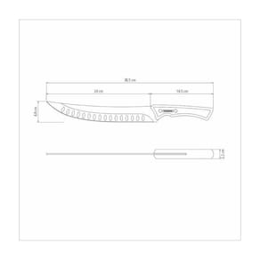 Com a faca para carne Tramontina Churrasco Black com lâmina em aço inox escurecido e cabo de madeira 10 polegadas ficou muito mais prático servir as melhores carnes no seu churrasco e com a garantia de um corte de alta qualidade. Produzida com lâmina de aço inox escurecido com excelente afiação, ela é ideal para cortes maiores. Sua lâmina conta com sulcos que minimiza o seu atrito com a carne. O cabo em madeira com rebites proporciona um manuseio muito mais firme e confortável, além de um estilo diferenciado. Escolha Tramontina e veja a praticidade tomar conta do seu dia a dia!