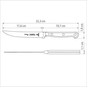 Faca para Churrasco e Frutas Tramontina Century com Lâmina em Aço Inox e Cabo de Policarbonato e Fibra de Vidro 5" Nada pior do que "estragar" uma bela peça de carne com uma faca que não corta direito. Com a Faca para Churrasco e Frutas Tramontina Century com Lâmina em Aço Inox e Cabo de Policarbonato e Fibra de Vidro 5 polegadas da linha Century você não irá passar por isso. A Faca para Churrasco é produzida com lâmina em aço inox, com cabo em policarbonato com fibra de vidro. Além disso, ela recebe tratamento térmico composto por têmpera (aquecimento da lâmina), sub-zero (resfriamento de -50° C a -196° C ) e revenimento (aumento da flexibilidade do aço especial), proporcionando vida longa da lâmina. Para tornar o manuseio ainda mais seguro e confortável, o cabo é anatômico e ergonômico. Suas características irão garantir que a lâmina deslize sobre a carne, oferecendo aquele corte bonito e perfeito, para deixar qualquer um com água na boca. Informações Gerais Com fio serrilhado, é ideal para o corte de carnes cozidas e frutas. A lâmina forjada de aço inox especial garante um fio com maior durabilidade e precisão. A lâmina possui tratamento térmico diferenciado, composto por têmpera, sub-zero e revenimento. E conta com dureza da lâmina de 55 e 58 HRC, que garante maior resistência do fio e precisão no corte. O cabo de policarbonato reforçado com fibra de vidro garante alta durabilidade, equilíbrio e segurança. O cabo ergonômico proporciona maior segurança, equilíbrio e conforto na hora do corte. Pode ir à máquina de lavar louças facilitando seu dia a dia.